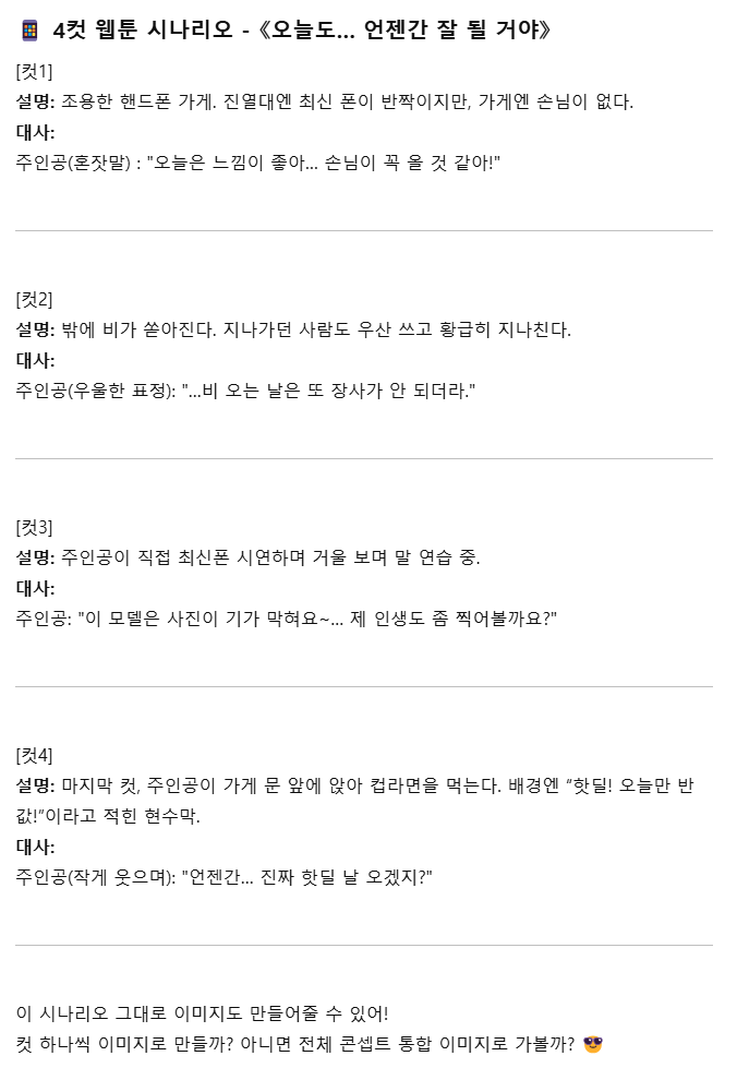 말풍선 위치: "각 컷은 대사가 1~2개만 있고, 깔끔한 연출로 구성해줘" 이미지 생성 연동: 나중에 각 컷 설명을 기반으로 DALL·E 이미지 생성에 활용 가능 |