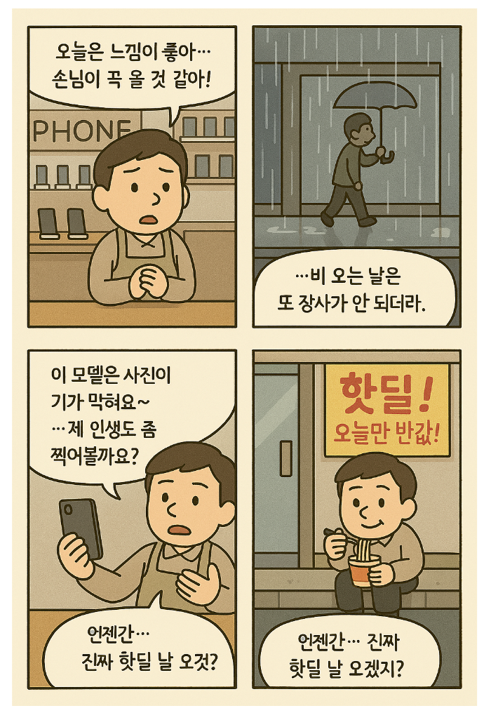 | 나는 4컷 웹툰을 만들고 싶어. 주제는 "1인 자영업자가 장사가 안 돼 고민하는 모습. 유쾌한 블랙코미디 스타일로 해줘." 웹툰은 각 컷에 짧고 명확한 대사와 상황이 있어야 해. 캐릭터의 감정과 행동이 잘 드러나도록 해줘. 각 컷에는 "설명(화면 연출)" + "대사" 형태로 써줘. 아래와 같은 형식으로 출력해줘: [컷1]
