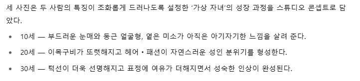 | 이미지 속 두 인물 사이에 자녀가 있다고 가정해줘. 자녀의 얼굴 생김새를 실사 사진 이미지로 생성해줘. 나이는 10살, 20살, 30살. 3장의 이미지 만들어줘. 배경: 스튜디오 |