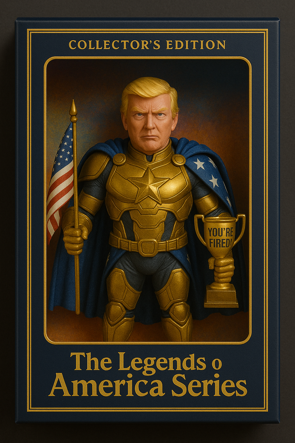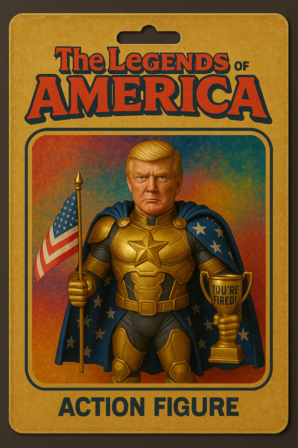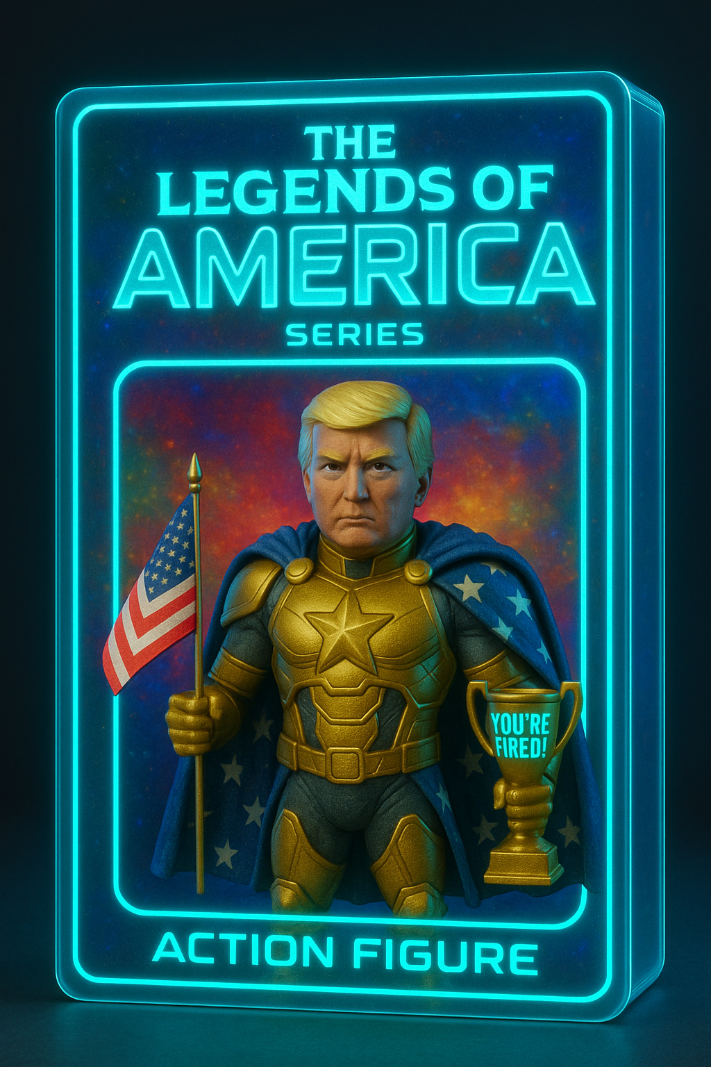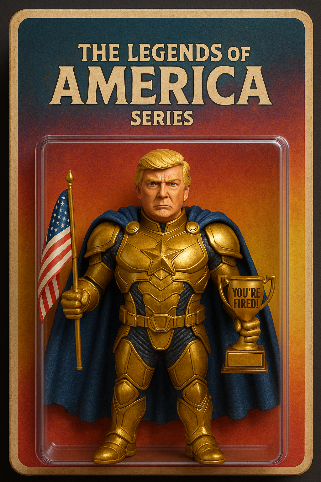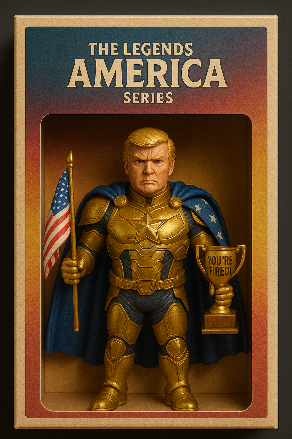 | 아래 내용 3D 피규어 만들어줘. 피규어 스타일: 슈퍼히어로 + 금색 갑옷 + 별 망토 소품: 미니 미국 국기, 'You're Fired!' 트로피 패키지: 빈티지 스타일 블리스터 팩 텍스트: 'The Legends of America Series' 포즈: 정면 응시, 카리스마 넘치는 표정 조명/배경: 스튜디오 조명, 화려하고 컬러풀한 배경 |