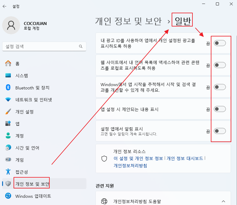 (1) 위와 같이 [설정] > [개인 정보 및 보안] > [일반]으로 이동합니다.