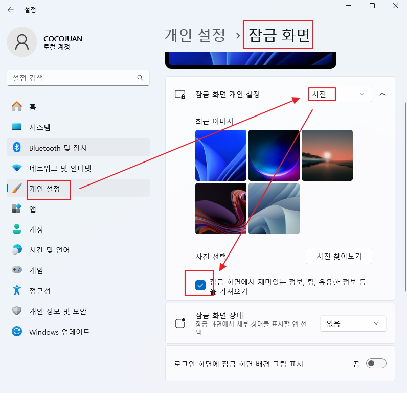(2) 잠금 화면 개인 설정을 '사진'으로 변경합니다.