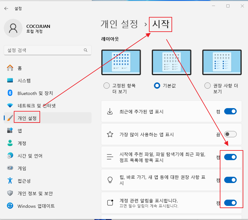 2. 윈도우11 광고 끄는 설정: 시작 메뉴 추천 앱 끄기