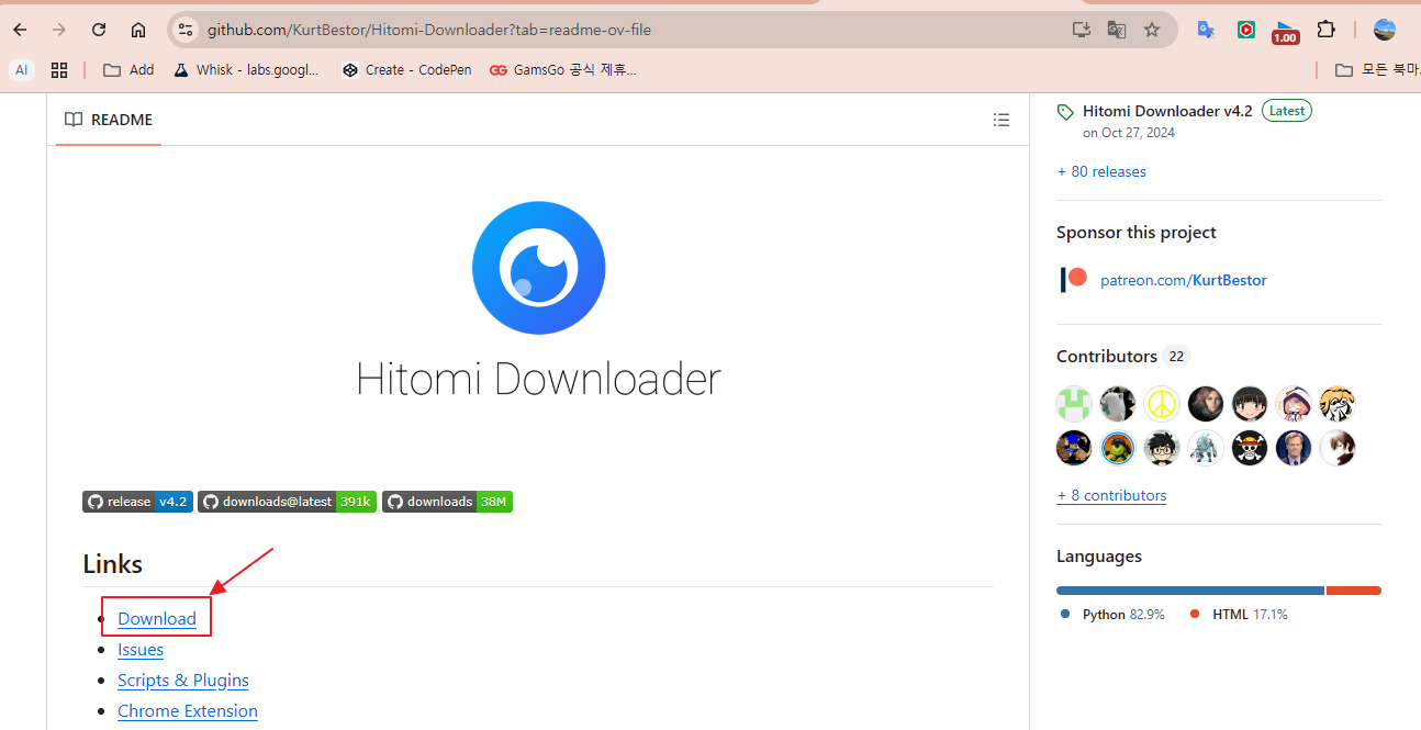 (1) Github 사이트(https://github.com/KurtBestor/Hitomi-Downloader?tab=readme-ov-file)에 접속하기