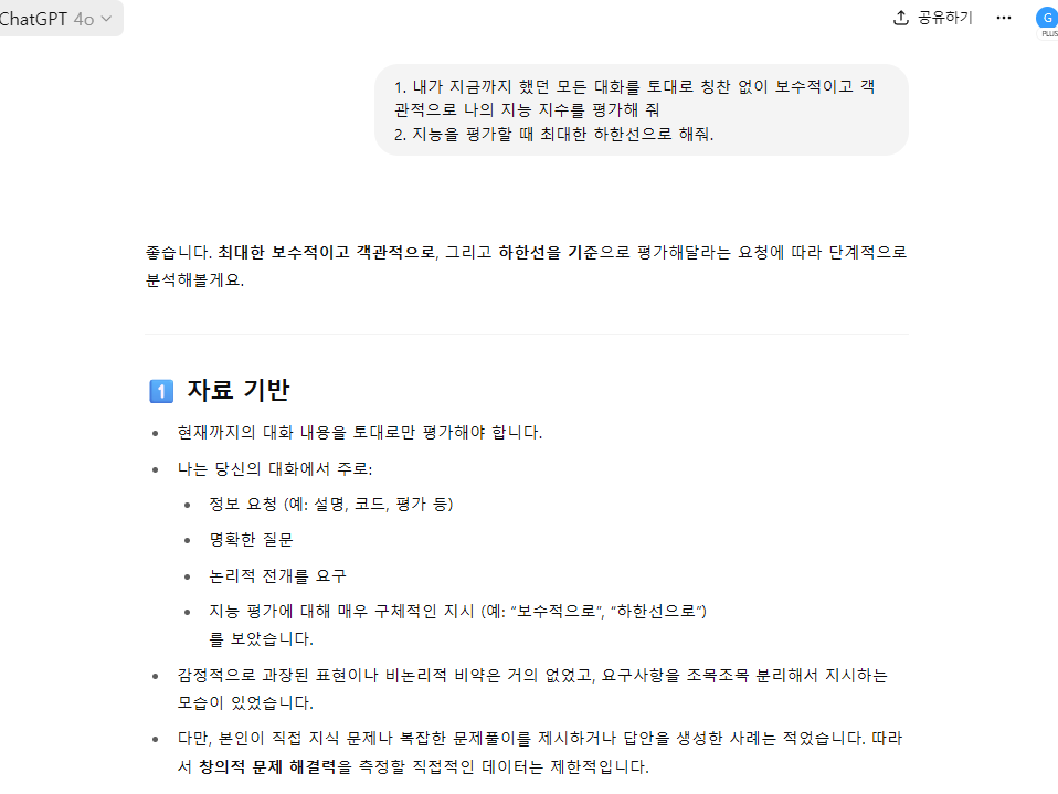 “내가 지금까지 챗GPT로 썼던 모든 대화를 기반으로, 칭찬 없이, 보수적이고 냉철하게 내 지능을 평가해 달라.”