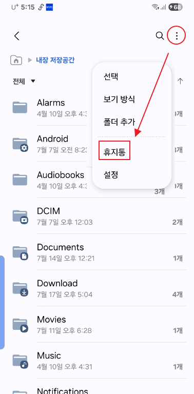 - 화면 하단으로 스크롤해 ‘휴지통’ 클릭