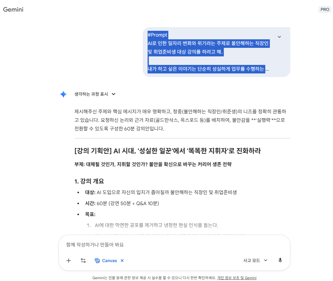 | #Prompt AI로 인한 일자리 변화와 위기라는 주제로 불안해하는 직장인 및 취업준비생 대상 강의를 하려고 해. 내가 하고 싶은 이야기는 단순히 성실하게 업무를 수행하는 능력은 이제 소용이 없고, AI를 도구로 활용해 새로운 가치를 기획하고 지시할 수 있는 능력을 키워야 한다는 이야기를 하고 싶어. 그리고 요리책을 100권을 읽어도 요리를 못 하듯이, AI가 내 직업을 대체할까 걱정만 할 게 아니라 실제 업무 워크플로우에 AI를 직접 적용해보며 'AI 문해력(Literacy)'을 높여야 대체되지 않는다는 점을 강조하고 싶어. 그리고 어차피 효율성과 속도는 AI가 압도할 테니, 인간만이 할 수 있는 공감, 창의성, 고도의 판단력이 필요한 영역으로 커리어의 방향을 잡으라는 내용으로 해서, 골드만삭스 보고서나 옥스포드 대학의 일자리 전망 연구 같은 구체적 데이터를 근거로 60분짜리 강의안을 한번 만들어보자. 아직 슬라이드는 만들지 말고 강의 구성안만 작성해줘. |